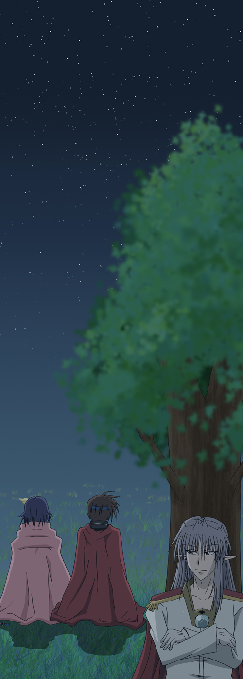 夜空の中、ランとアスラが仲良くお喋りをしていて、
